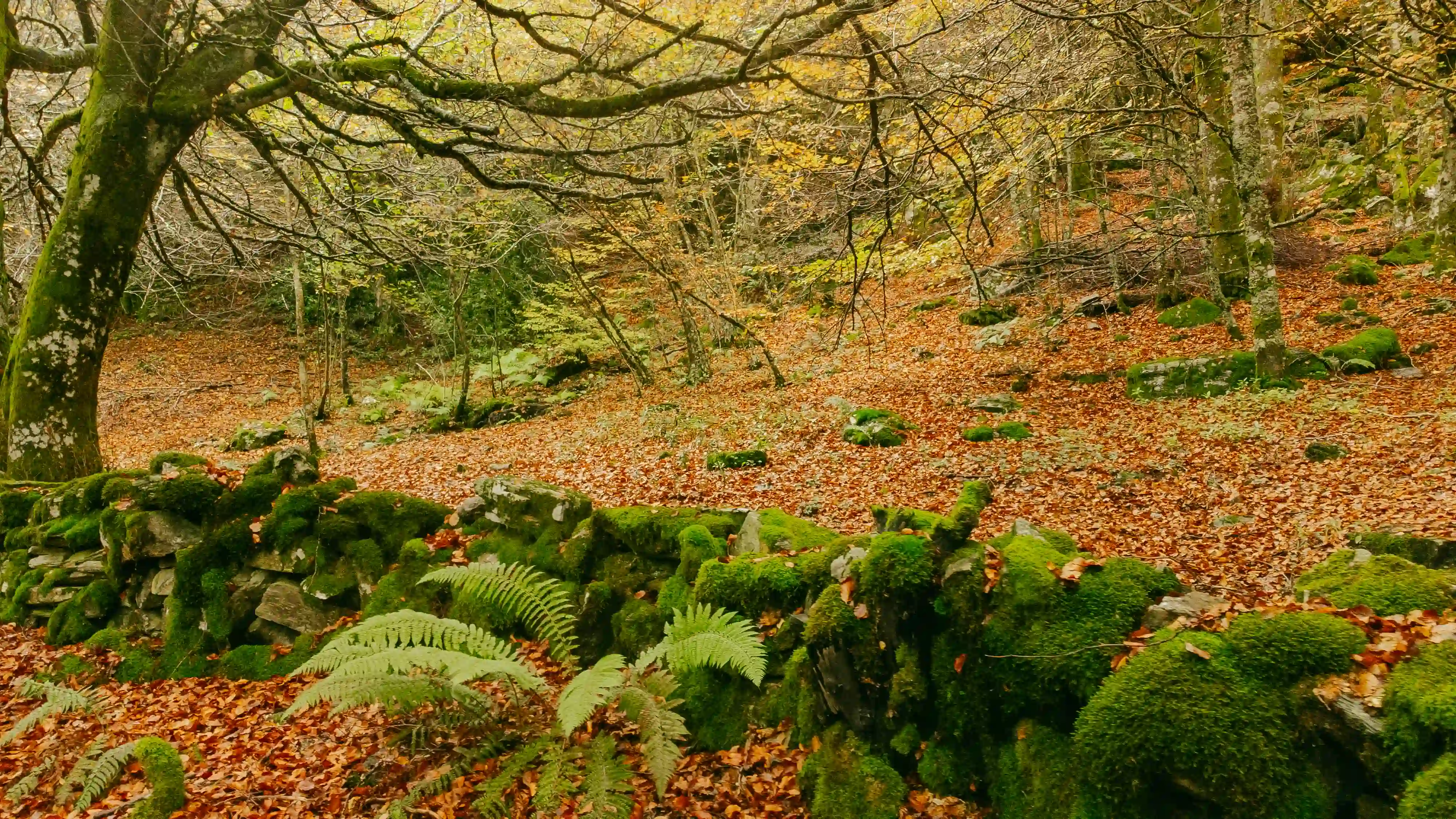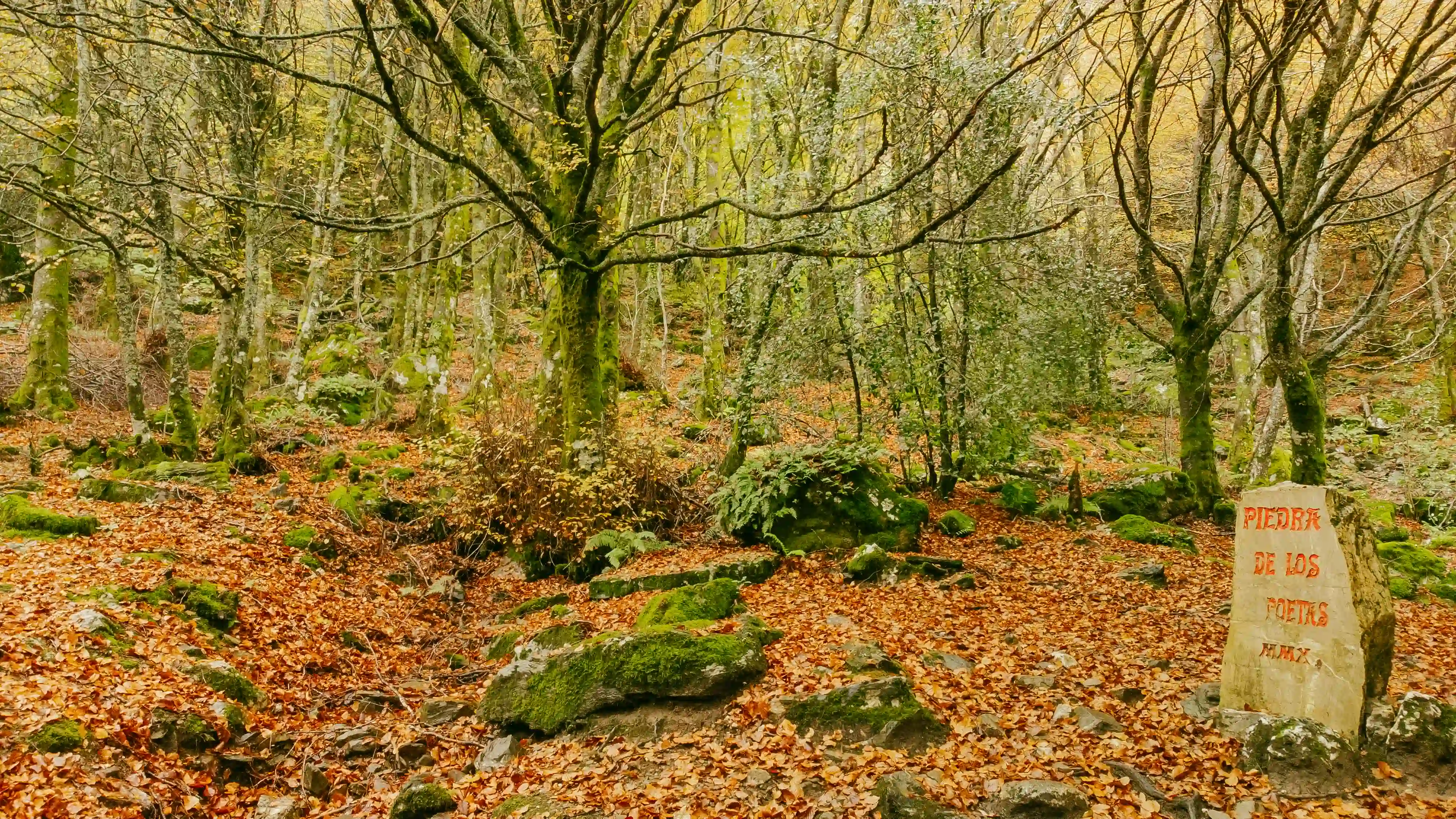 Espectacular hayedo leonés, ideal para senderismo otoñal, con rutas que cruzan riachuelos, cascadas y cuevas naturales.